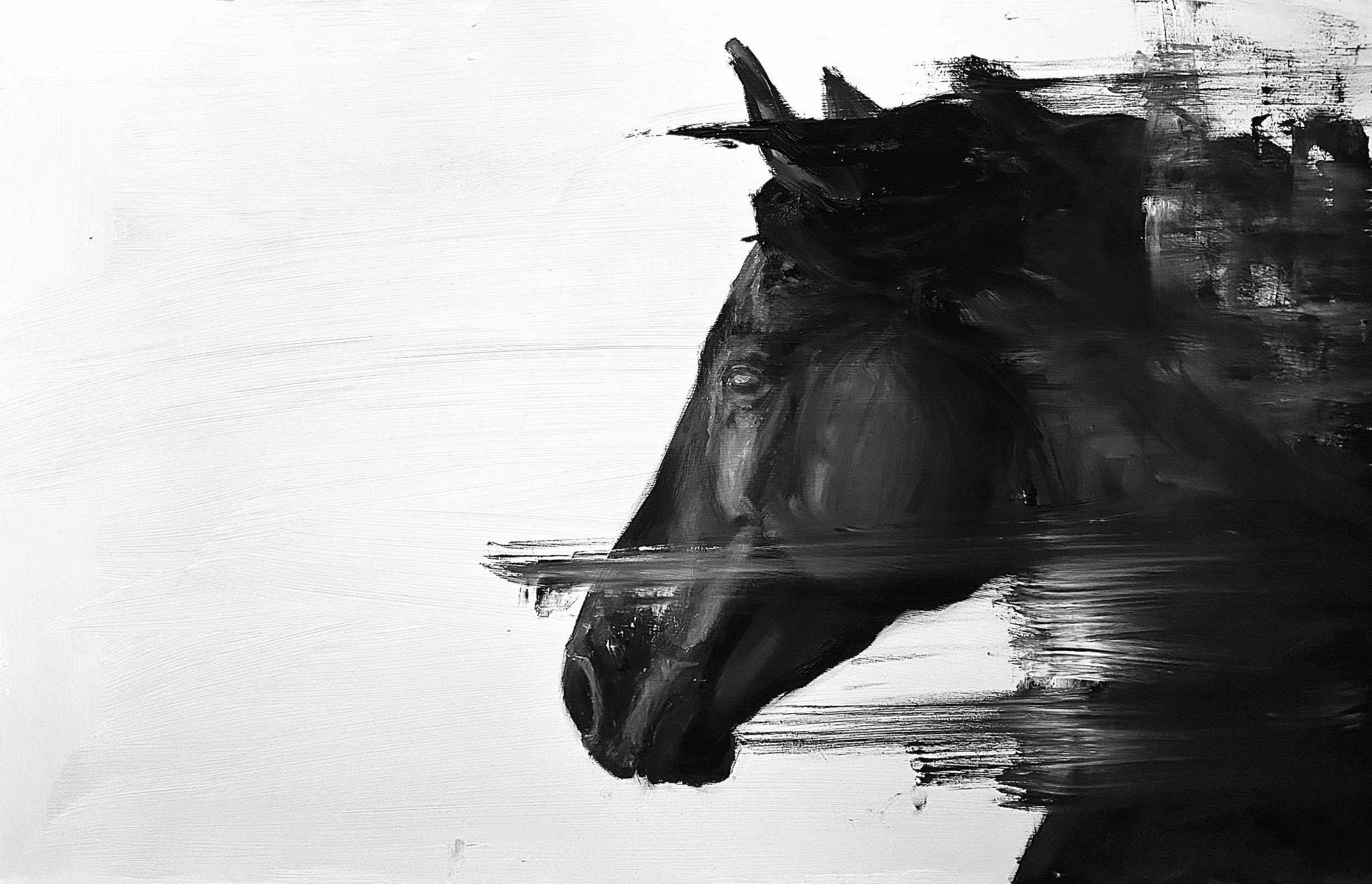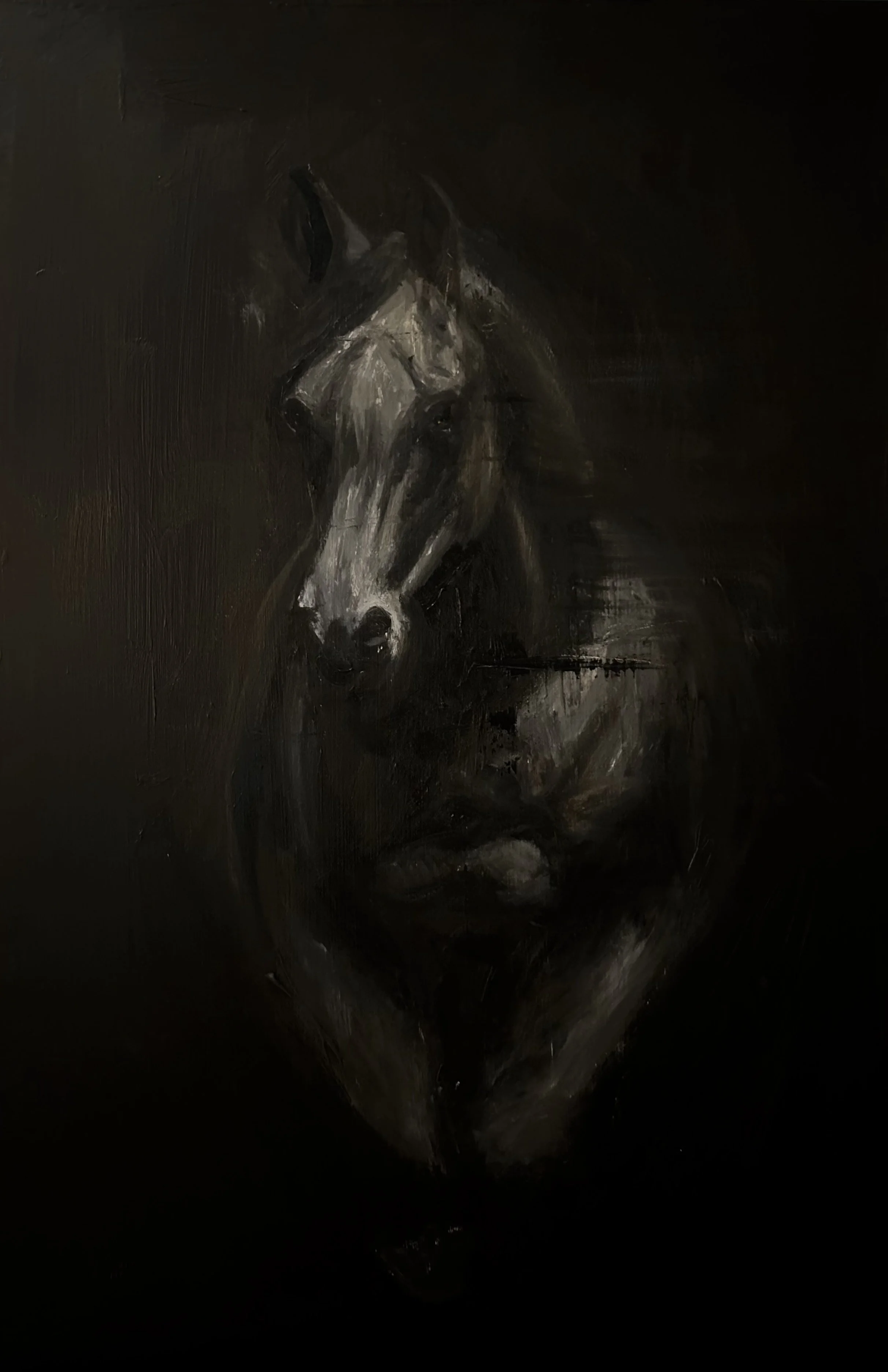 His equestrian oil paintings explore the dramatic interplay between darkness and light. Horses emerge from obscurity with striking presence, their strength and movement revealed through bold contrasts and expressive brushwork. The work evokes splendour and power, presenting the horse not simply as a subject, but as a force—resilient, commanding and alive with energy.